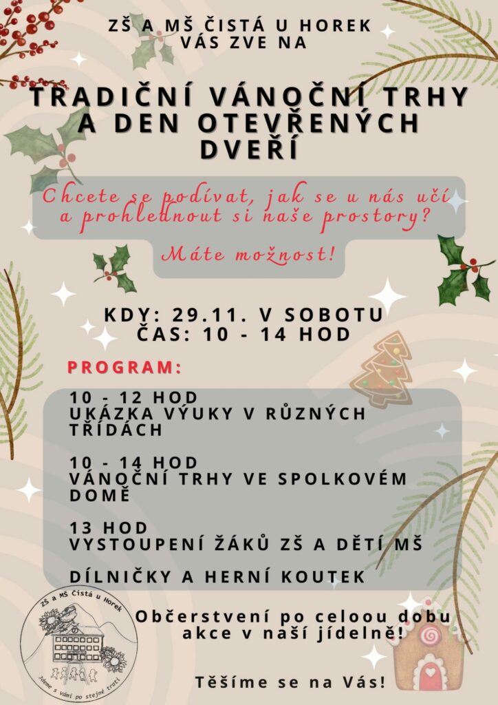 🎄 Zveme všechny rodiče, děti i přátele školy na kouzelnou sobotu plnou vánoční atmosféry! Letos jsme Vánoční trhy spojili s dnem otevřených dveří, takže si můžete nejen nakoupit drobné dárky a vychutnat si sváteční náladu