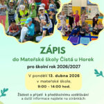 Zápis k předškolnímu vzdělávání v Mateřské škole Čistá u Horek proběhne v pondělí 13. dubna 2026 od 9:00 do 14:00 hodin. K žádosti je potřeba doložit rodný list dítěte, občanský průkaz jednoho ze zákonných zástupců a potvrzení lékaře o očkování […]