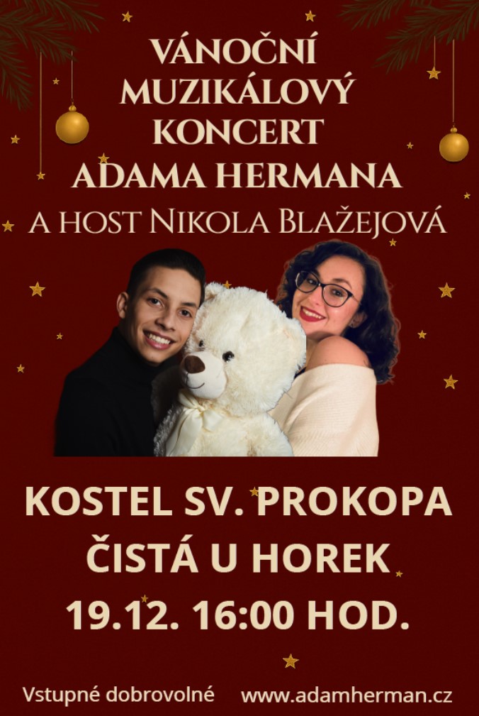 Read more →Přijďte si i letos poslechnout písně v podání našeho absolventa Adama Hermana. Tentokrát vystoupí i s hostem: Nikolou Blažejovou. Koncert proběhne v pátek 19.12.2025 od 16 hodin v kostele sv. Prokopa v Čisté u Horek. Adam studuje na Mezinárodní konzervatoři […]