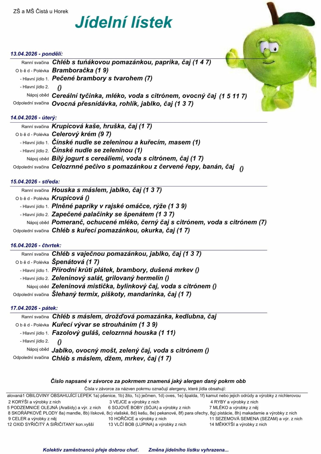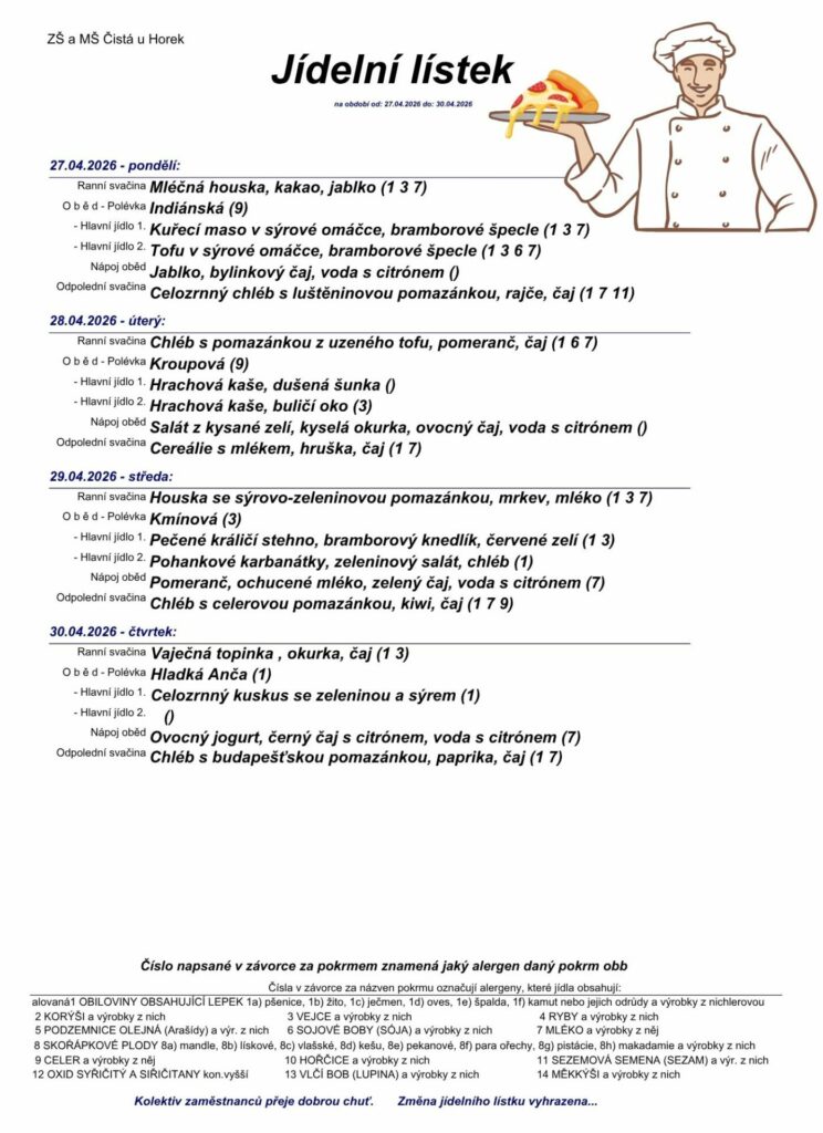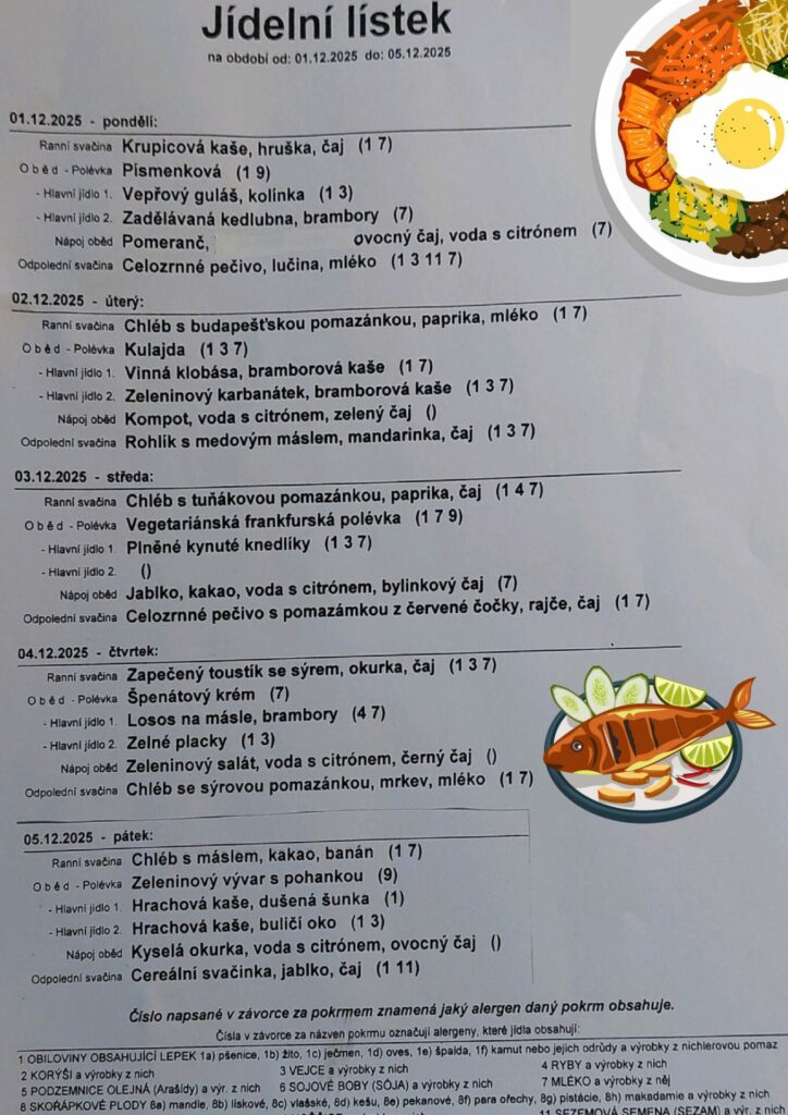 Školní jídelna Vážení rodiče, v případě odhlášení oběda prosíme o informaci nejpozději den předem. V případě, že oběd zapomenete odhlásit, je možné si ho vyzvednout. Děkujeme. Odhlašujte formou SMS na tel. čísle 605755793 (vedoucí školní jídelny). Informace pro rodičeStáhnout Vnitřní řád školní jídelny